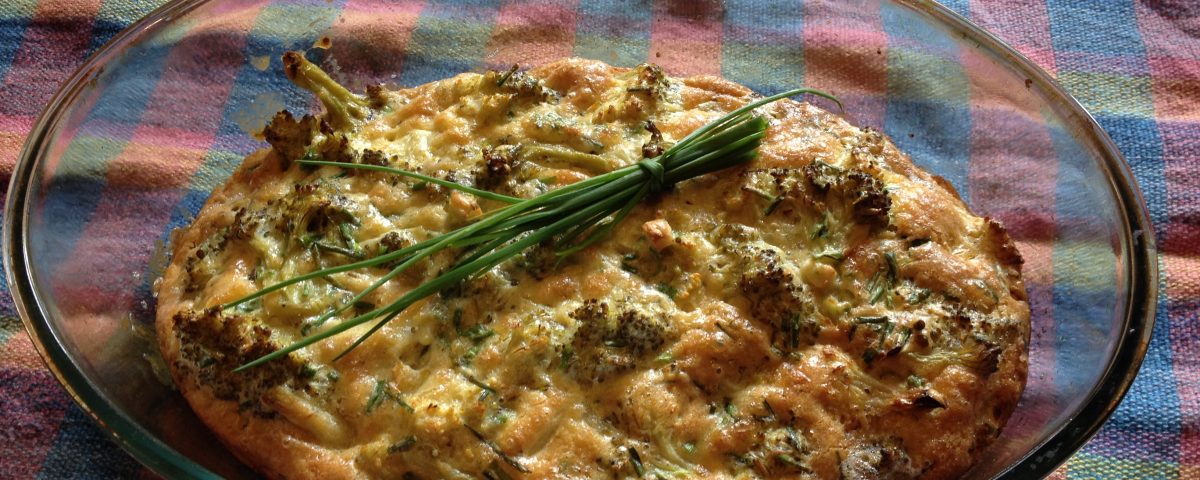 Unir ambos preparados con el brócoli, colocar sobre la masa ya cocida y llevar a horno suave hasta su cocción.